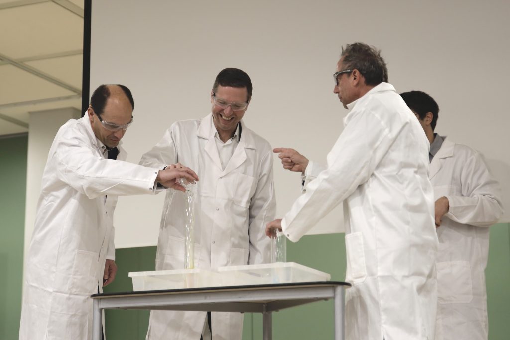 Florian Wiedemann ließ es sich nicht nehmen, gemeinsam mit dem Staatsminister Thorsten Glauber und dem Bürgermeister der Stadt Hollfeld, Hartmut Stern, unter der Anleitung der Physik- und Chemie-Lehrkräfte, OStR Heiko Müller und StR Andreas Kothmann, einen chemischen Versuch durchzuführen – selbstverständlich in der vorgeschriebenen Schutzbekleidung.