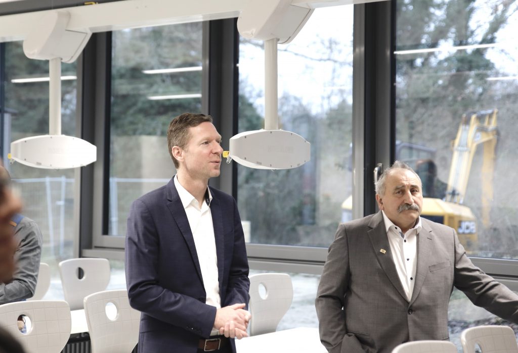 Landrat Florian Wiedemann, Vorsitzender des Zweckverbandes der GSH und damit Auftraggeber für den Neubau, sowie Staatsminister Thorsten Glauber lobten die mutigen Investition in eine zukunftsweisende Bildung und dankten den Förderern und Unterstützern des Projektes, dem Zweckverband der Gesamtschule Hollfeld, dem Landkreis Bayreuth und v.a. der Regierung von Oberfranken, vertreten durch Regierungsvizepräsidenten Thomas Engel, sowie der Oberfrankenstiftung.